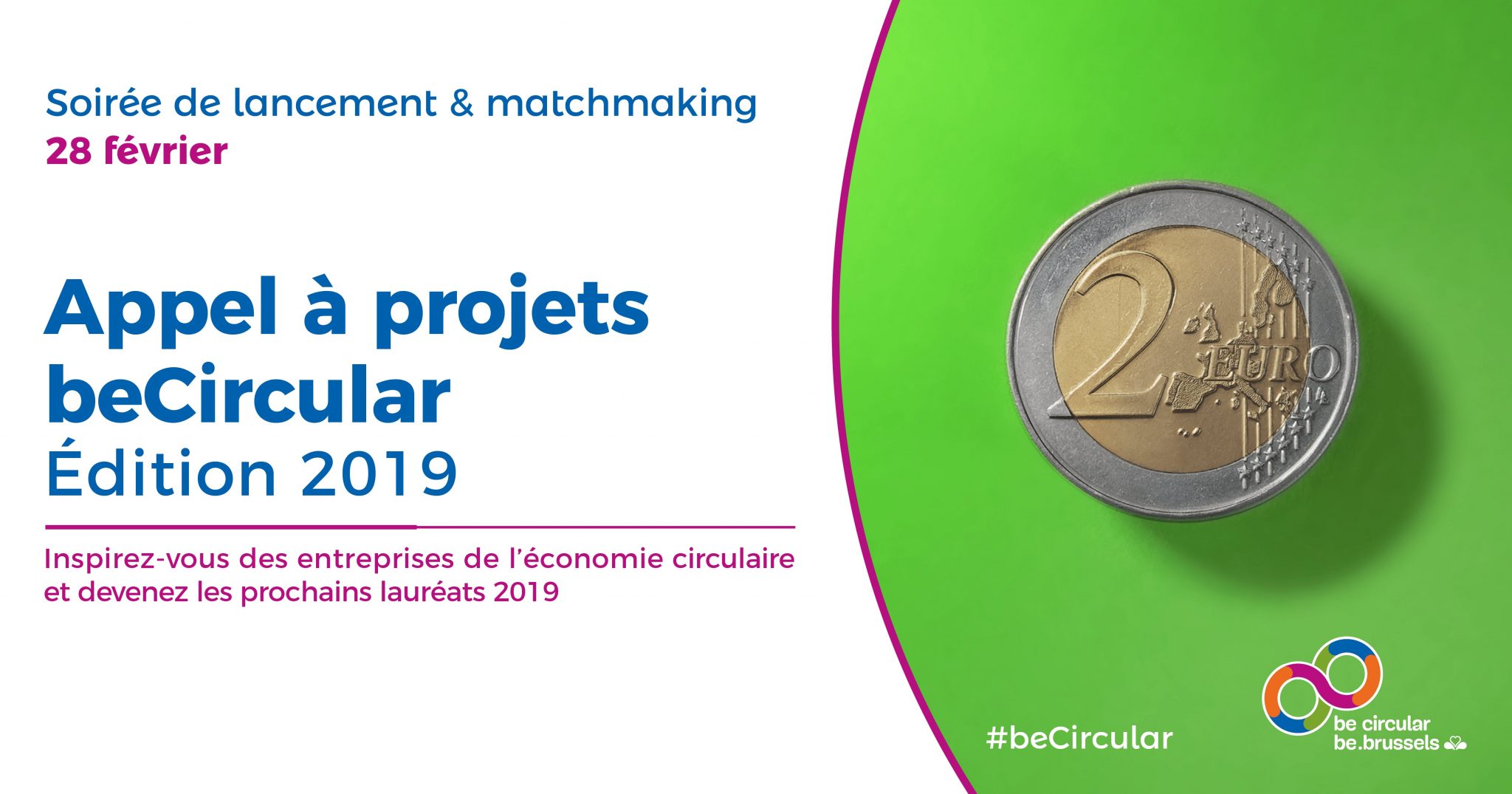 El próximo 28 de febrero de 17:00h a 21:00h se presentará la nueva convocatoria para los proyectos “beCircular 2019”. Durante el evento, se presentarán las bases de la convocatoria de proyectos de esta edición 2019, se entregarán los premios a los ganadores de 2018 y se realizará un matchmaking. Será una oportunidad única para conocer a empresarios que se han embarcado en la economía circular, así como para descubrir proyectos innovadores a solo un paso de casa. Aquí podéis consultar el programa completo.